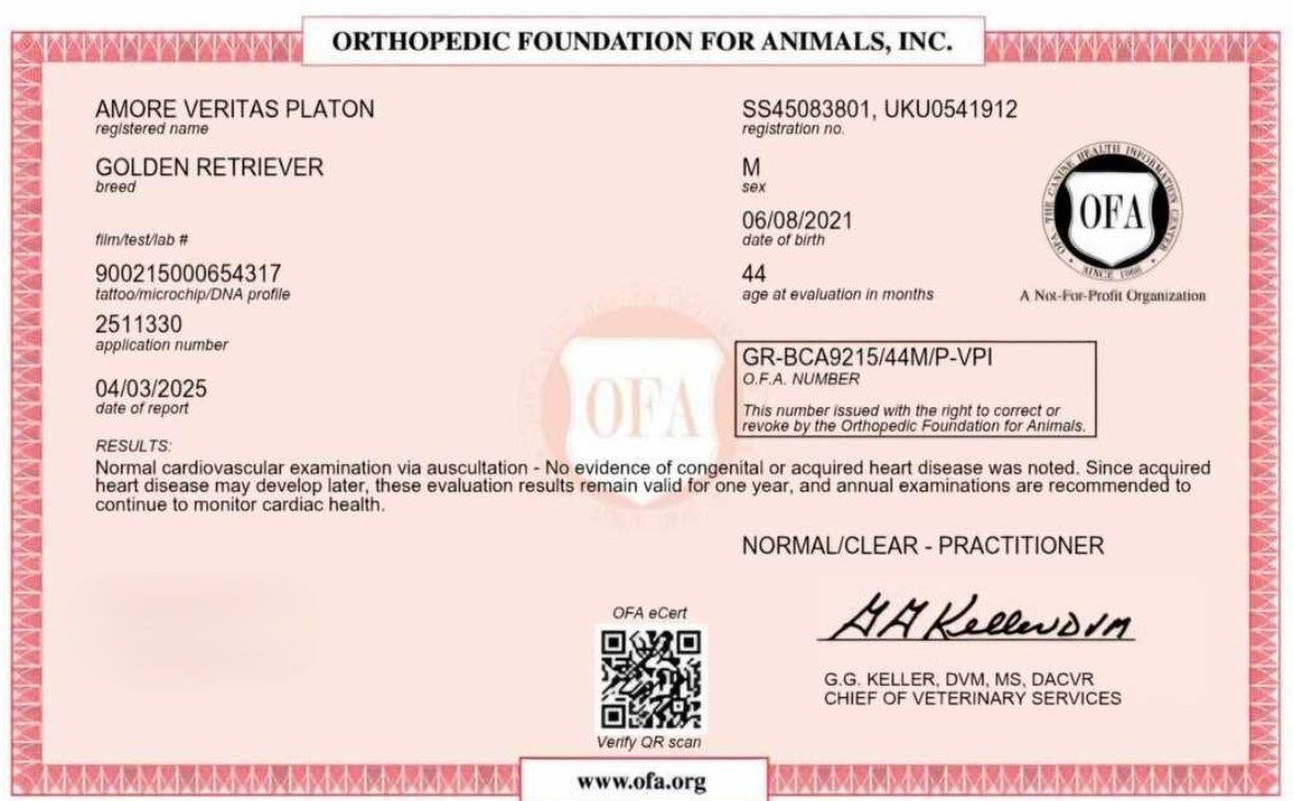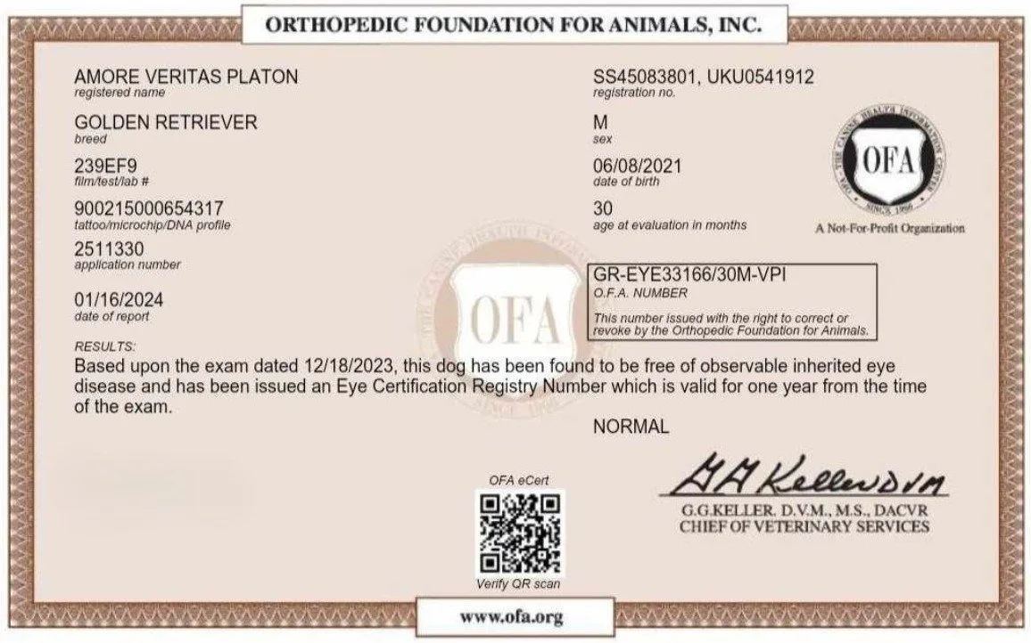 Ofa certifications & genetic screening for Amore Veritas Platon